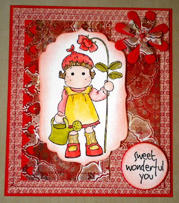 The colours you've used are beautiful and I love that flower embellishment. She's such a cutie watering her flowers.